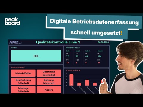 Diese Lösung dient als interaktives Dashboard für die manuelle Betriebsdatenerfassung in der Qualitätskontrolle. Über ein Touchscreen-Display können die Mitarbeitenden mit dem Dashboard interagieren und Eingaben zu den geprüften Artikeln machen. Ist ein Artikel fehlerfrei, kann der Werker oder die Werkerin das durch Drücken des “OK”-Buttons festhalten. Bei Ausschuss wiederum, kann der Fehler über die entsprechenden Buttons näher spezifiziert werden.